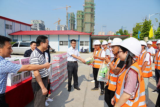 炎炎夏日,驕陽似火。2018年8月8日上午,公司黨委書記、董事長、總經(jīng)理陳杰,公司黨委委員、董事、紀委書記陳繼良一行來到合肥人才公寓項目施工現(xiàn)場慰問一線施工人員。
