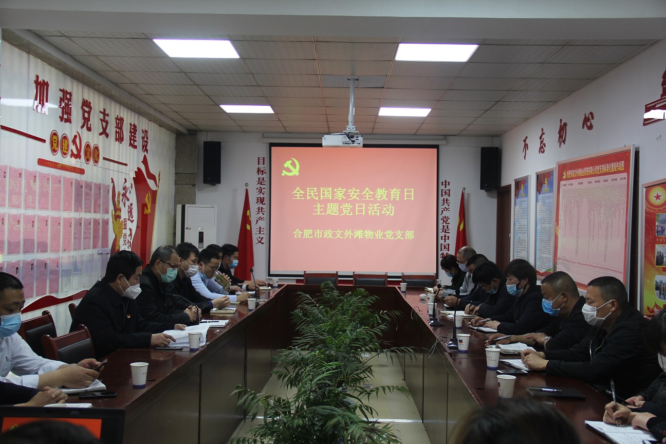 合肥市政文外灘物業(yè)管理有限公司黨支部于2020年4月15日下午在支部黨員活動室舉行“國家安全教育日”主題黨日活動,活動由支部副書記黃建軍主持,支部全體黨員參加此次活動。