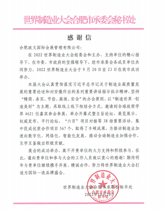 近日,合肥政文國際會展管理有限公司收到世界制造業(yè)大會合肥市承委會秘書處感謝信,信中對政文會展支持和保障“2022世界制造業(yè)大會”表示衷心感謝!