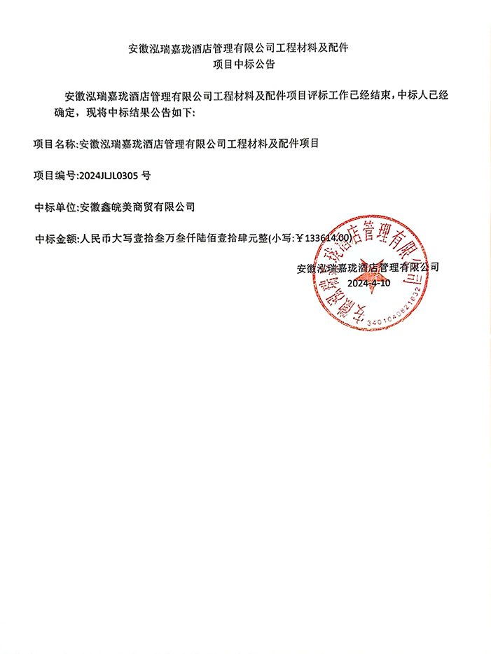 安徽泓瑞嘉瓏酒店管理有限公司工程材料及配件項目中標公告