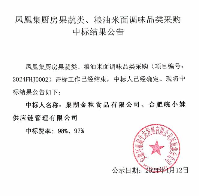 鳳凰集廚房果蔬類、糧油米面調(diào)味品類采購中標(biāo)結(jié)果公告