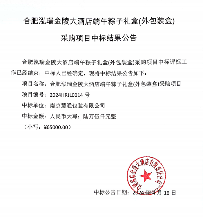 合肥泓瑞金陵大酒店端午粽子禮盒(外包裝盒)采購項目中標結(jié)果公告