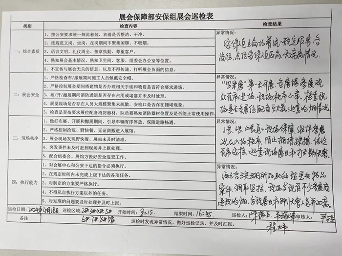 安保班組每天都組織保安巡邏隊(duì)在展館內(nèi)及外圍、地下車庫展館四周巡檢,做好現(xiàn)場安全秩序的管理;同時(shí)集中巡查野快餐、展蟲的情況,進(jìn)行清理;對館內(nèi)存在的吸煙、污染較大的施工作業(yè)等安全隱患的行為進(jìn)行巡查,提醒糾正。