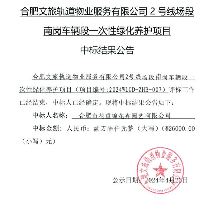 合肥文旅軌道物業(yè)服務(wù)有限公司2號線場段南崗車輛段一次性綠化養(yǎng)護項目中標(biāo)結(jié)果公告