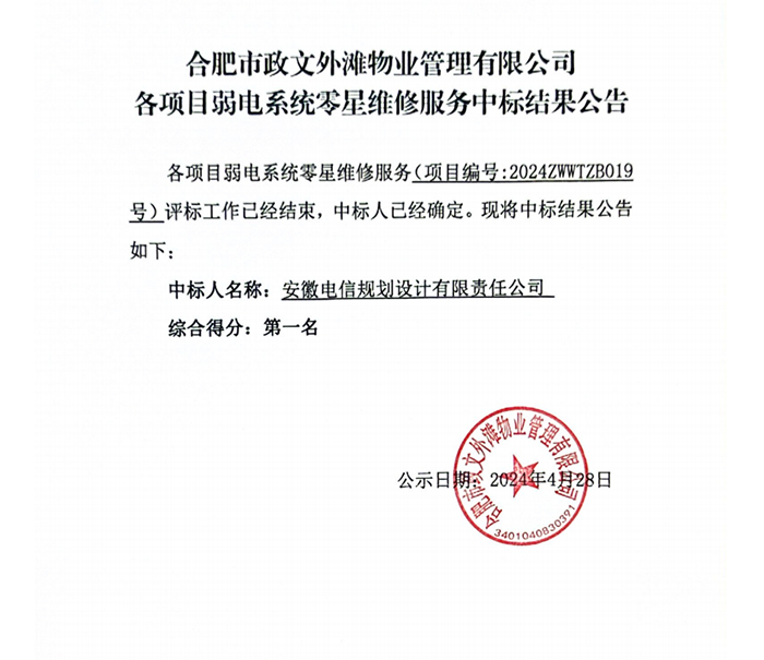合肥市政文外灘物業(yè)管理有限公司各項(xiàng)目弱電系統(tǒng)零星維修服務(wù)中標(biāo)結(jié)果公告