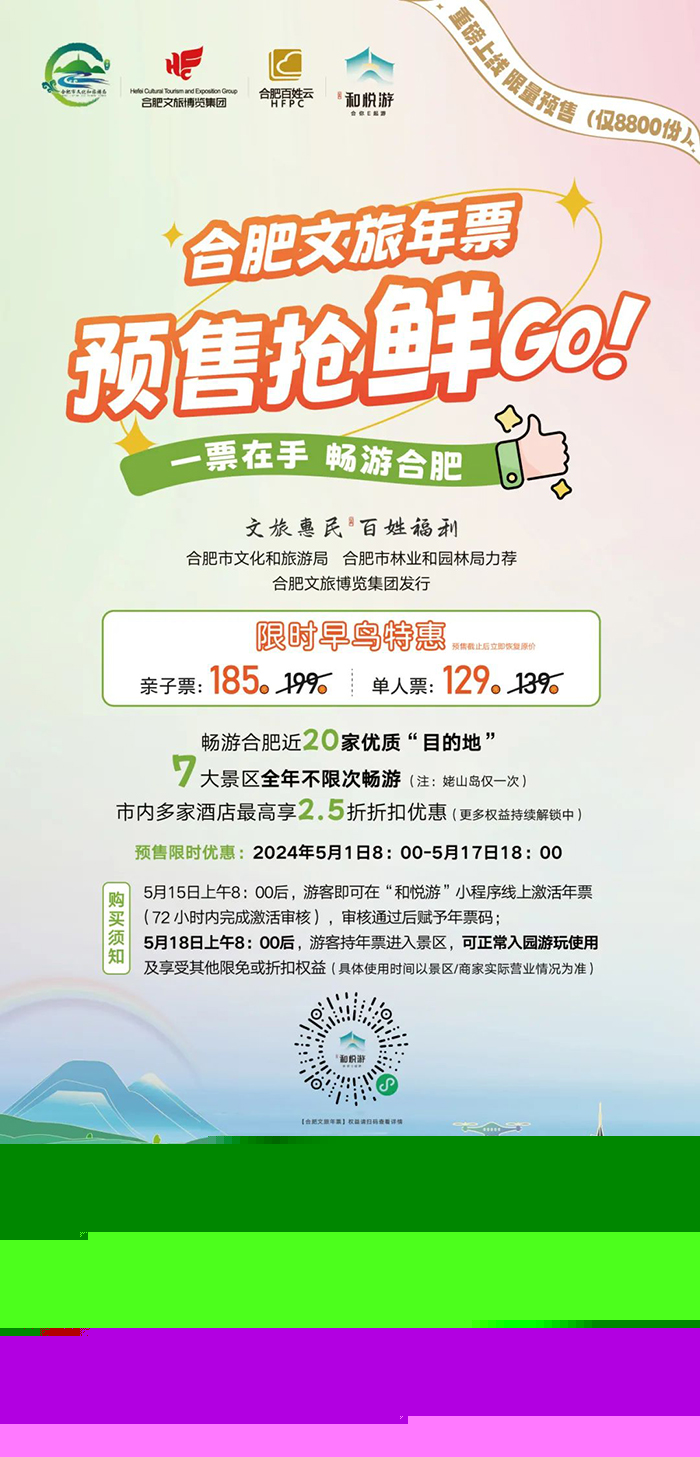從即日起至5月17日18:00,市民可在微信搜索“和悅游”小程序,點擊進(jìn)入合肥文旅年票頁面,進(jìn)行預(yù)售購買。