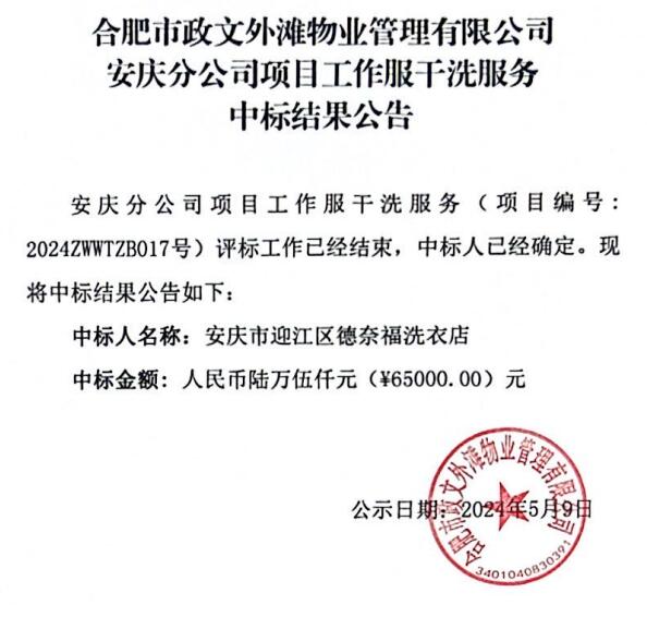 合肥市政文外灘物業(yè)管理有限公司安慶分公司項(xiàng)目工作服干洗服務(wù)中標(biāo)結(jié)果公告