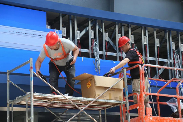 現(xiàn)場門頭舞臺搭建、桌椅搬運擺放