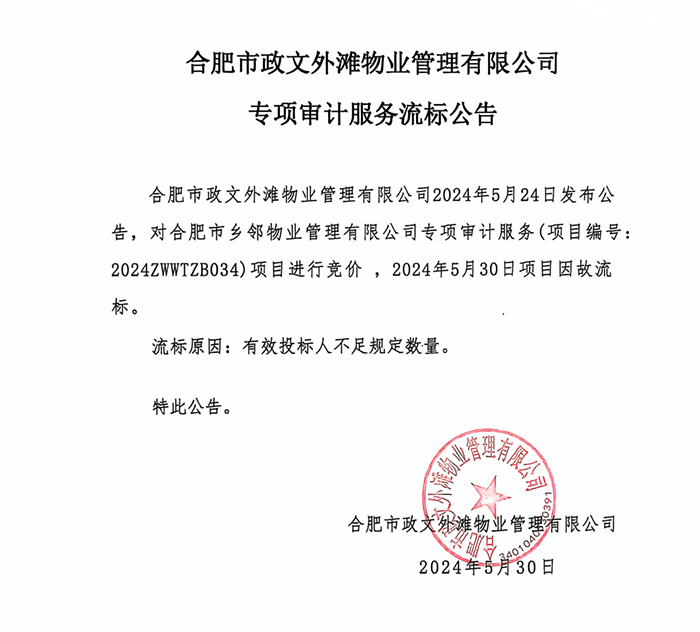 合肥市政文外灘物業(yè)管理有限公司專項審計服務(wù)流標(biāo)公告