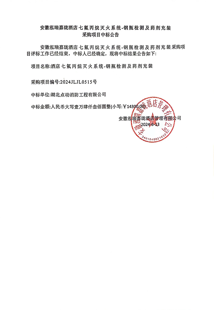 安徽泓瑞嘉瓏酒店 七氟丙烷滅火系統(tǒng)-鋼瓶檢測及藥劑充裝采購項(xiàng)目中標(biāo)公告