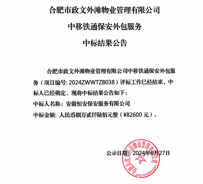 合肥市政文外灘物業(yè)管理有限公司中移鐵通保安外包服務(wù) 中標結(jié)果公告