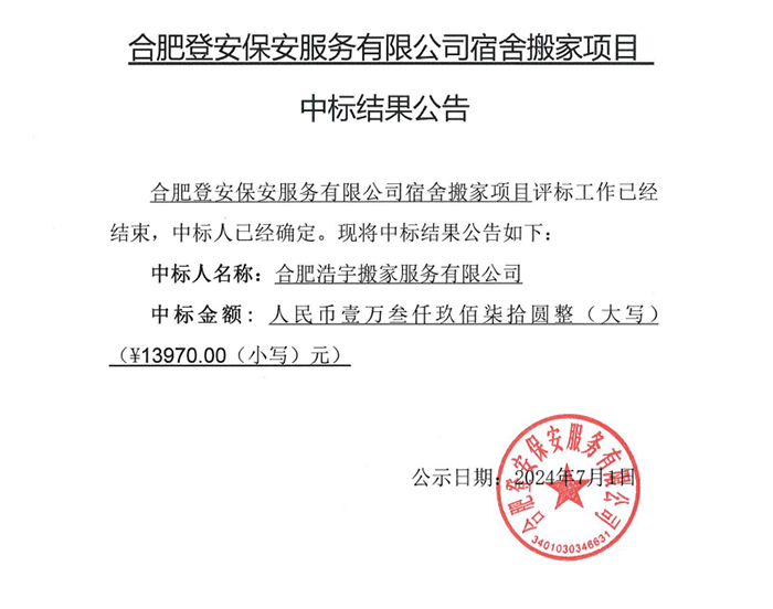 合肥登安保安服務(wù)有限公司宿舍搬家項目 中標(biāo)結(jié)果公告