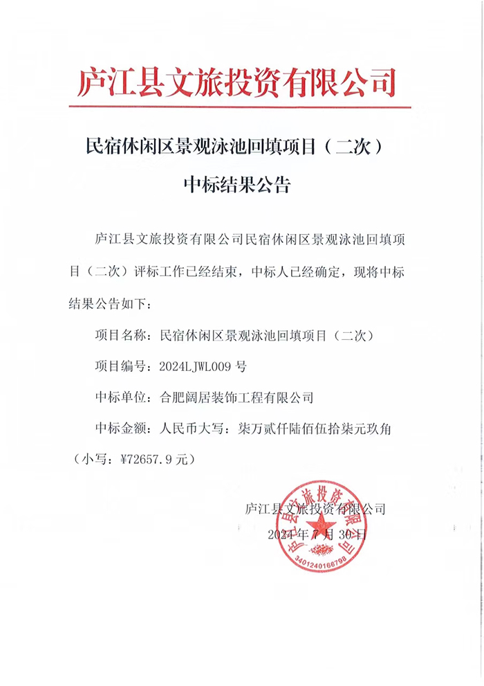 民宿休閑區(qū)景觀泳池回填項目(二次)中標結(jié)果公告