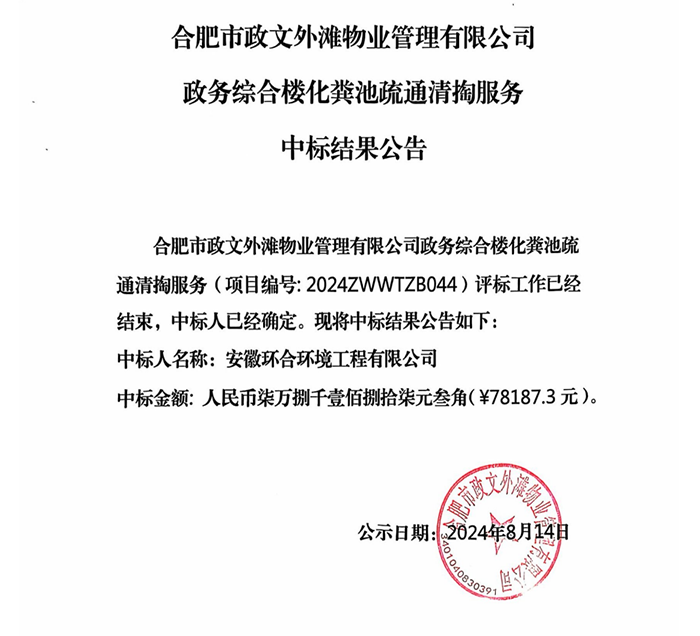 合肥市政文外灘物業(yè)管理有限公司政務(wù)綜合樓化糞池疏通清掏服務(wù)中標(biāo)結(jié)果公告