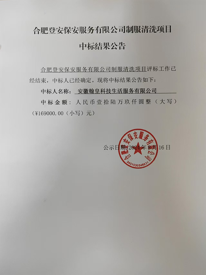 合肥登安保安服務(wù)有限公司制服清洗項(xiàng)目中標(biāo)結(jié)果公告