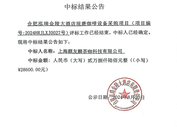 合肥泓瑞金陵大酒店現(xiàn)磨咖啡設備采購項目