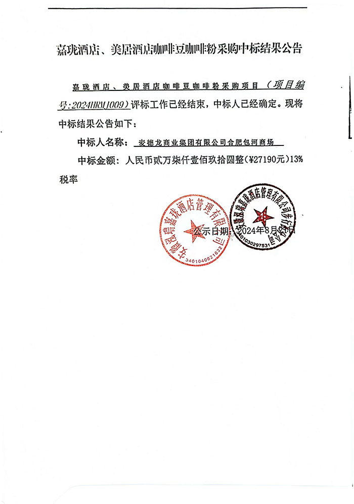 嘉瓏酒店、美居酒店咖啡豆咖啡粉采購中標結(jié)果公告