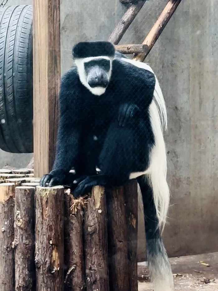 合野的東非黑白疣猴圈舍在園區(qū)的最北端,景觀橋北端橋頭附近,這里主要生活著兩個東非黑白疣猴家族,大黑三黑一家和好黑老白一家(咱們的起名主打一個樸實(shí)無華),一個群體由一只成年雄性+幾只雌性+幼崽組成,一般雌性會共同育幼。