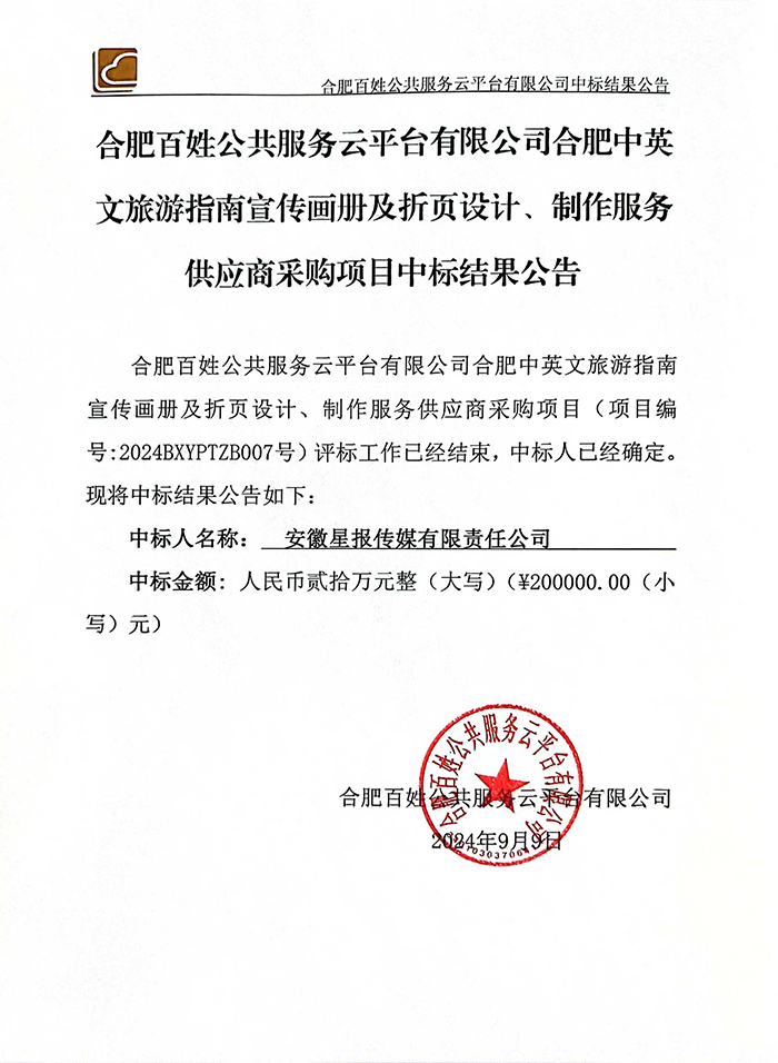 合肥百姓公共服務(wù)云平臺(tái)有限公司合肥中英文旅游指南宣傳畫冊(cè)及折頁設(shè)計(jì)、制作服務(wù)供應(yīng)商采購項(xiàng)目中標(biāo)結(jié)果公告