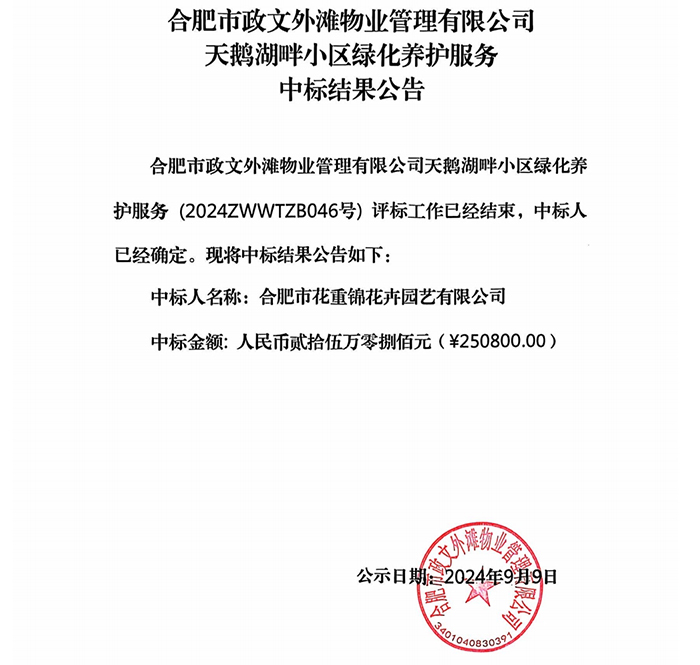 合肥市政文外灘物業(yè)管理有限公司天鵝湖畔小區(qū)綠化養(yǎng)護服務(wù)中標(biāo)結(jié)果公告