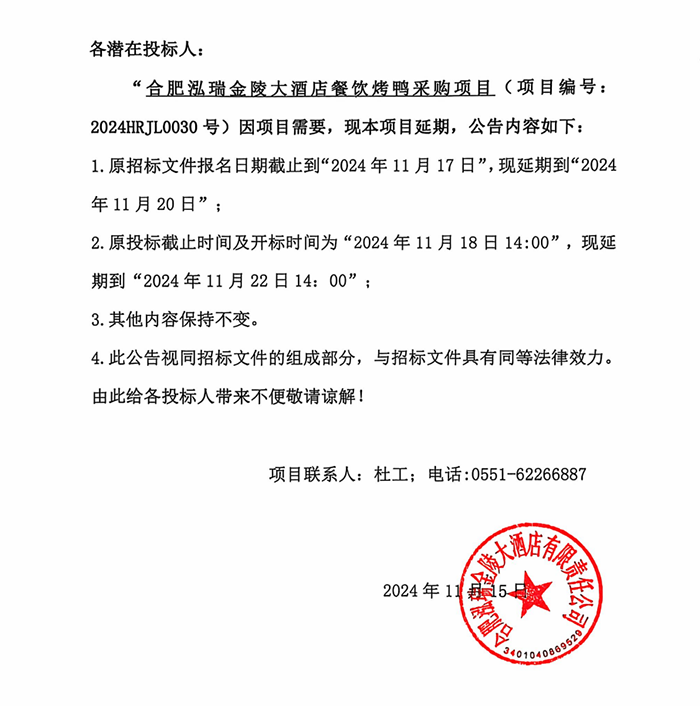 合肥泓瑞金陵大酒店餐飲烤鴨采購項目