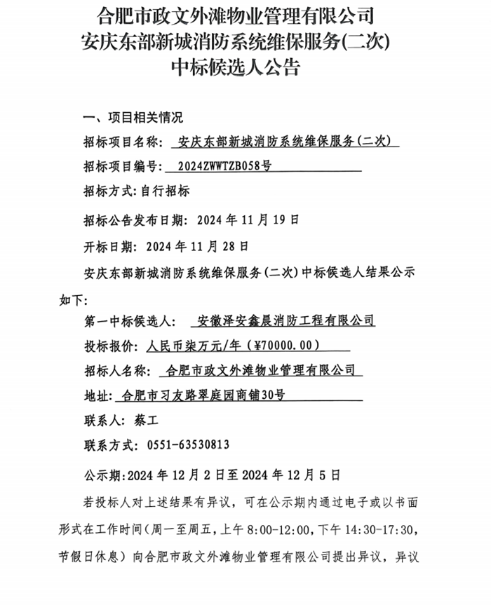 合肥市政文外灘物業(yè)管理有限公司安慶東部新城消防系統(tǒng)維保服務(wù)(二次)中標(biāo)候選人公告