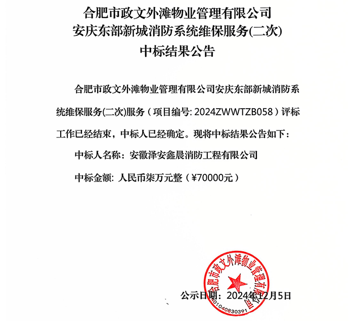合肥市政文外灘物業(yè)管理有限公司安慶東部新城消防系統(tǒng)維保服務(wù)(二次)中標(biāo)結(jié)果公告
