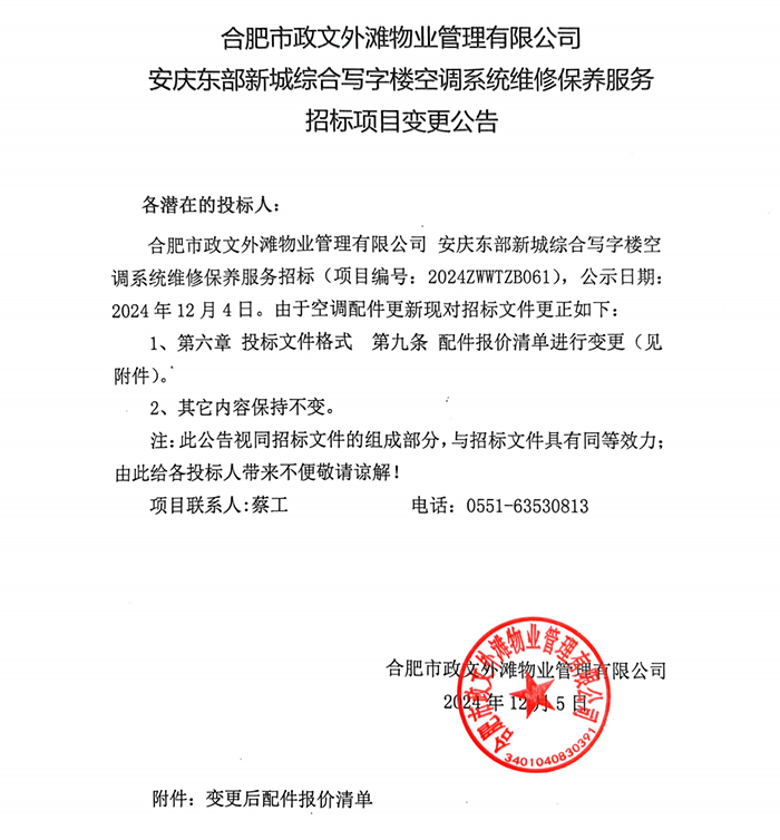 合肥市政文外灘物業(yè)管理有限公司安慶東部新城綜合寫字樓空調(diào)系統(tǒng)維修保養(yǎng)服務(wù)招標(biāo)項(xiàng)目變更公告
