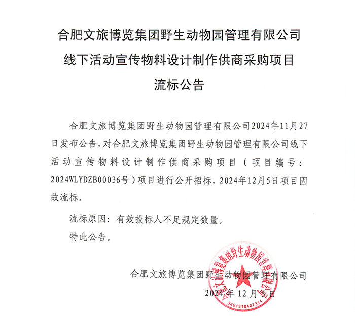 合肥文旅博覽集團野生動物園管理有限公司線下活動宣傳物料設計制作供商采購項目流標公告