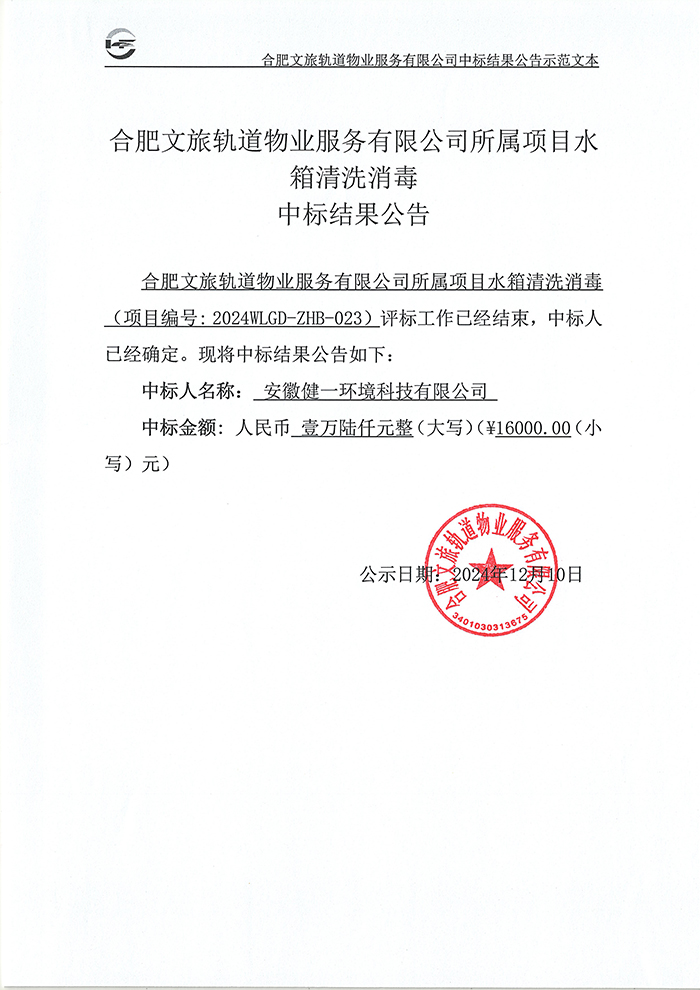 合肥文旅軌道物業(yè)服務(wù)有限公司所屬項(xiàng)目水箱清洗消毒中標(biāo)結(jié)果公告