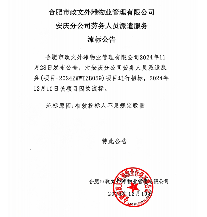 合肥市政文外灘物業(yè)管理有限公司安慶分公司勞務人員派遣服務流標公告