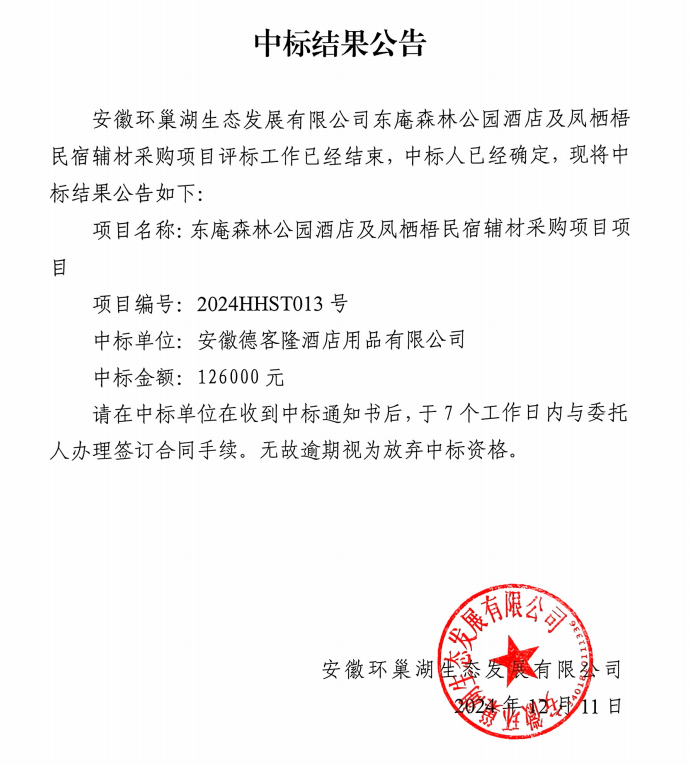 東庵森林公園酒店及鳳棲梧民宿輔材采購(gòu)項(xiàng)目中標(biāo)結(jié)果公告