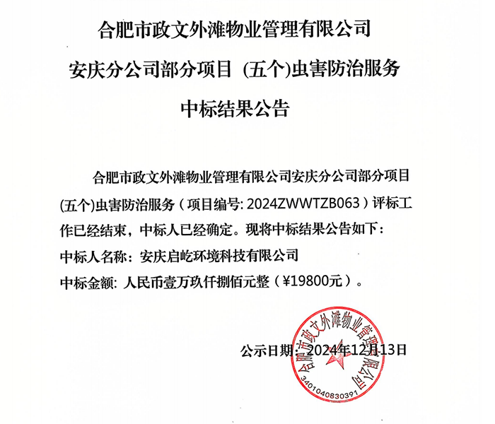 合肥市政文外灘物業(yè)管理有限公司安慶分公司部分項目(五個)蟲害防治服務中標結(jié)果公告