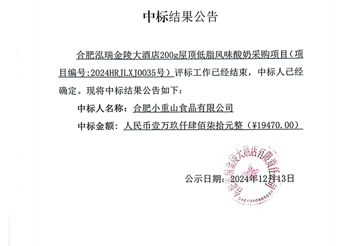 合肥泓瑞金陵大酒店200g屋頂?shù)椭L(fēng)味酸奶采購(gòu)項(xiàng)目
