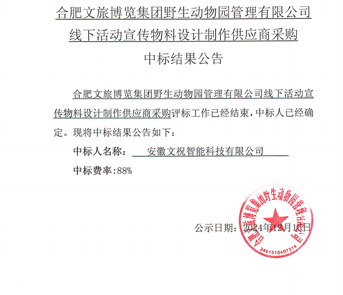 合肥文旅博覽集團(tuán)野生動(dòng)物園管理有限公司線下活動(dòng)宣傳物料設(shè)計(jì)制作供應(yīng)商采購(gòu)中標(biāo)結(jié)果公告
