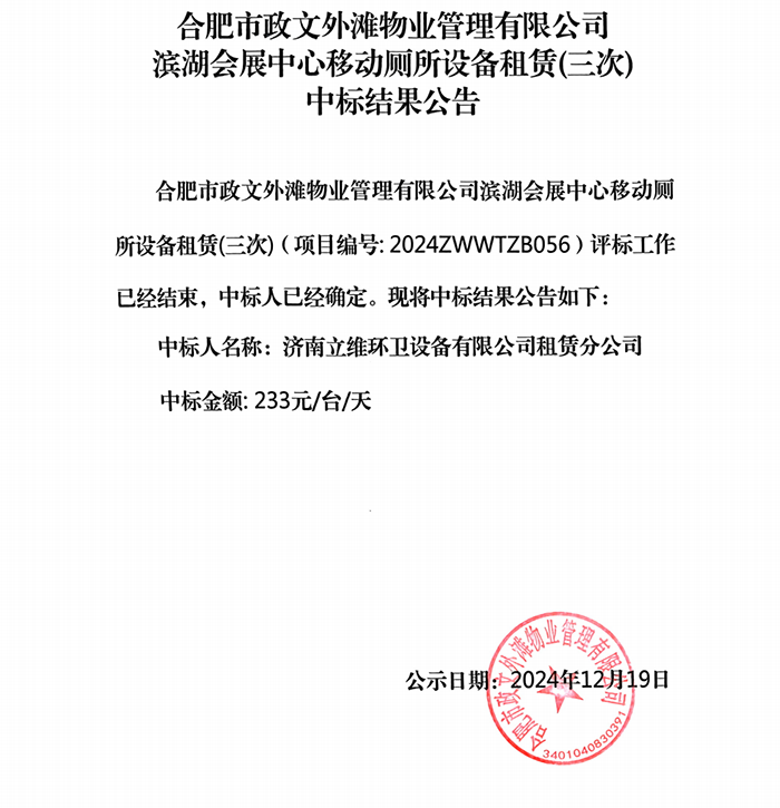 合肥市政文外灘物業(yè)管理有限公司濱湖會(huì)展中心移動(dòng)廁所設(shè)備租賃(三次)中標(biāo)結(jié)果公告
