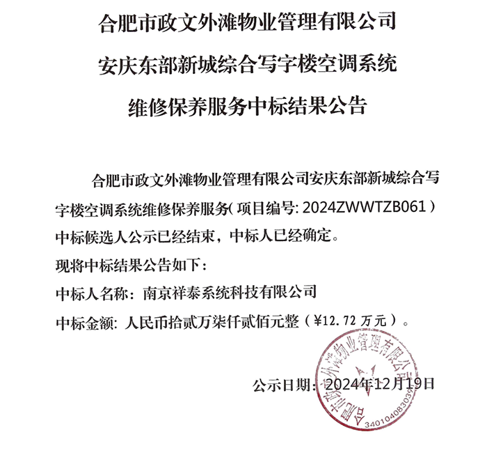 合肥市政文外灘物業(yè)管理有限公司安慶東部新城綜合寫字樓空調(diào)系統(tǒng)維修保養(yǎng)服務中標結(jié)果公告