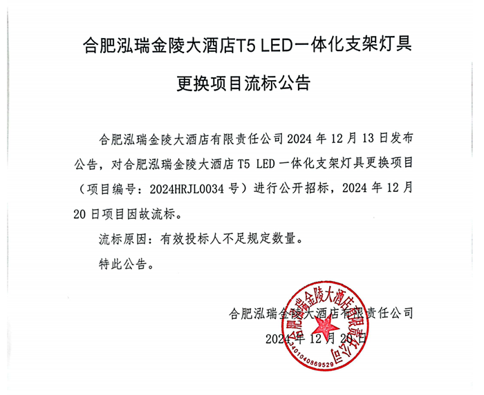 合肥泓瑞金陵大酒店T5 LED一體化支架燈具更換項目流標(biāo)公告