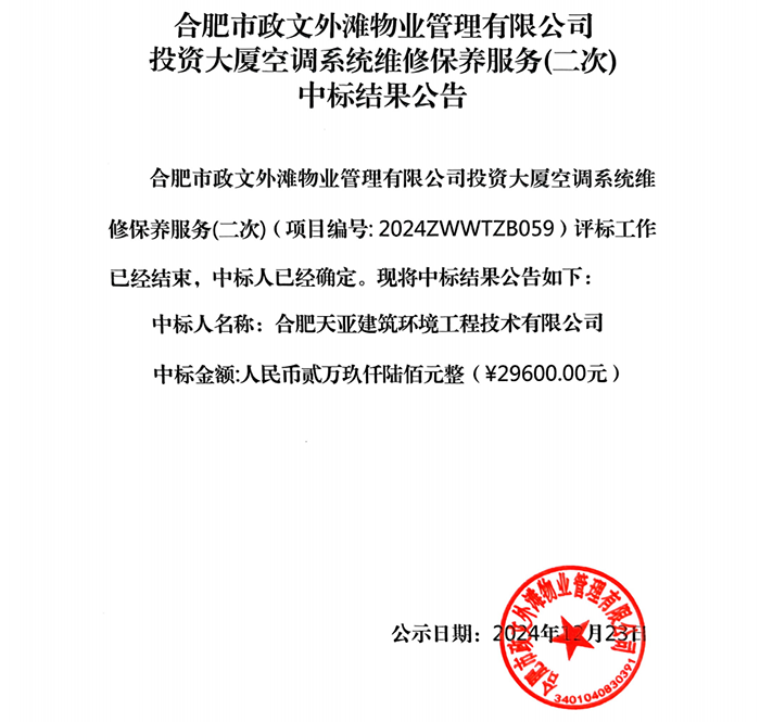 合肥市政文外灘物業(yè)管理有限公司投資大廈空調(diào)系統(tǒng)維修保養(yǎng)服務(wù)(二次)中標(biāo)結(jié)果公告