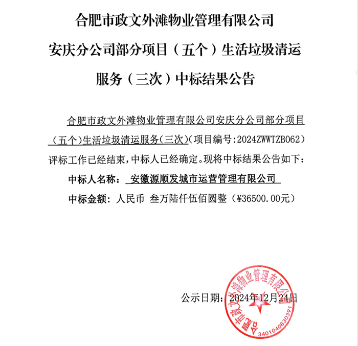 合肥市政文外灘物業(yè)管理有限公司安慶分公司部分項(xiàng)目(五個(gè))生活垃圾清運(yùn)服務(wù)(三次)中標(biāo)結(jié)果公告