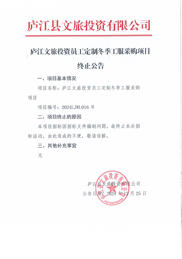 廬江文旅投資員工定制冬季工服采購項(xiàng)目 終止公告