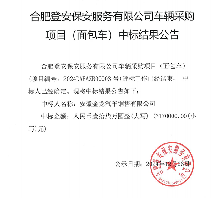 合肥登安保安服務(wù)有限公司車(chē)輛采購(gòu)項(xiàng)目(面包車(chē))中標(biāo)結(jié)果公告