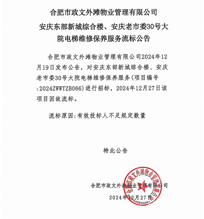 合肥市政文外灘物業(yè)管理有限公司安慶東部新城綜合樓、安慶老市委30號(hào)大院電梯維修保養(yǎng)服務(wù)流標(biāo)公告