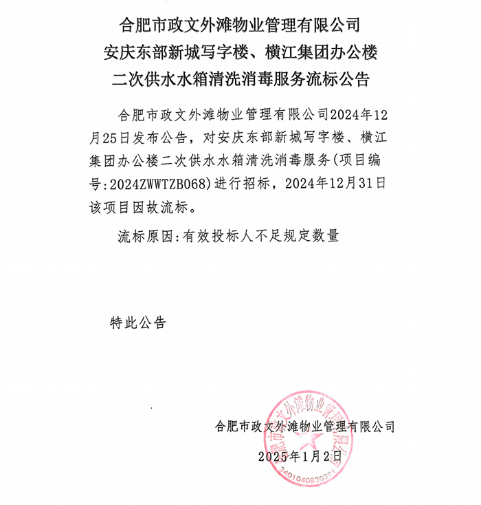 合肥市政文外灘物業(yè)管理有限公司安慶東部新城寫字樓、橫江集團(tuán)辦公樓二次供水水箱清洗消毒服務(wù)流標(biāo)公告