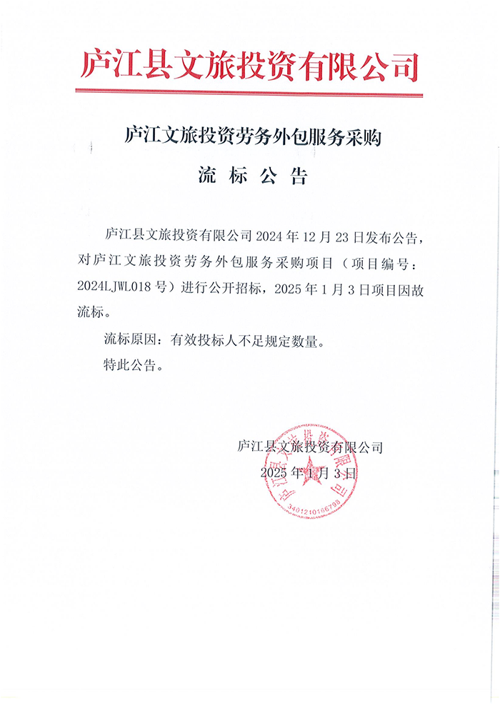 廬江文旅投資勞務(wù)外包服務(wù)采購(gòu)流標(biāo)公告