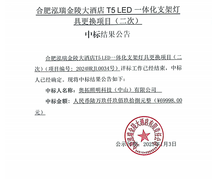合肥泓瑞金陵大酒店 T5 LED 一體化支架燈具更換項(xiàng)目(二次)中標(biāo)結(jié)果公告