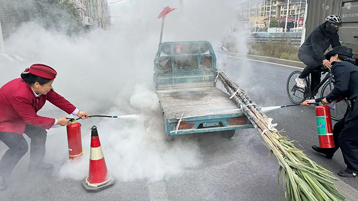 2024年12月,竇橋灣站外出入口發(fā)生一起電動車自燃事件。登安公司巡查站口安檢員發(fā)現(xiàn)火情后,第一時間通知站方,并迅速組織除人員積極參與滅火救援。在半小時左右的緊急救援中,共使用了七個滅火器,全力以赴撲滅火勢。