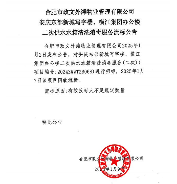 合肥市政文外灘物業(yè)管理有限公司安慶東部新城寫字樓、橫江集團(tuán)辦公樓二次供水水箱清洗消毒服務(wù)流標(biāo)公告
