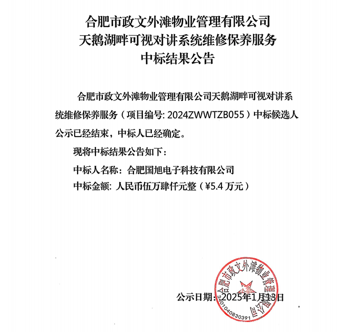 合肥市政文外灘物業(yè)管理有限公司天鵝湖畔可視對(duì)講系統(tǒng)維修保養(yǎng)服務(wù)中標(biāo)結(jié)果公告
