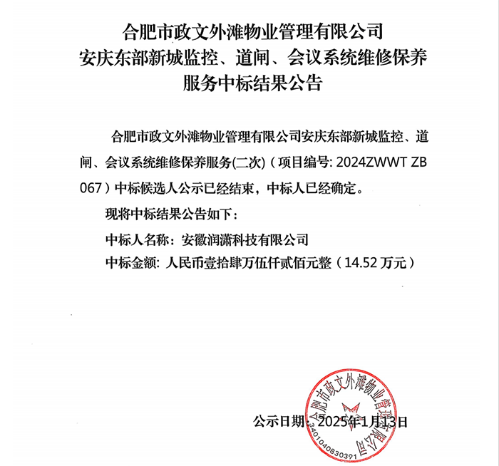 合肥市政文外灘物業(yè)管理有限公司安慶東部新城監(jiān)控、道閘、會議系統(tǒng)維修保養(yǎng)服務(wù)中標(biāo)結(jié)果公告
